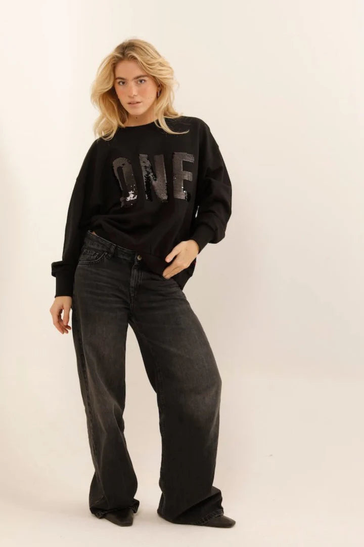 Avec sa coupe ample et son mot « ONE » brodé en sequins, il mixe confort et féminité.