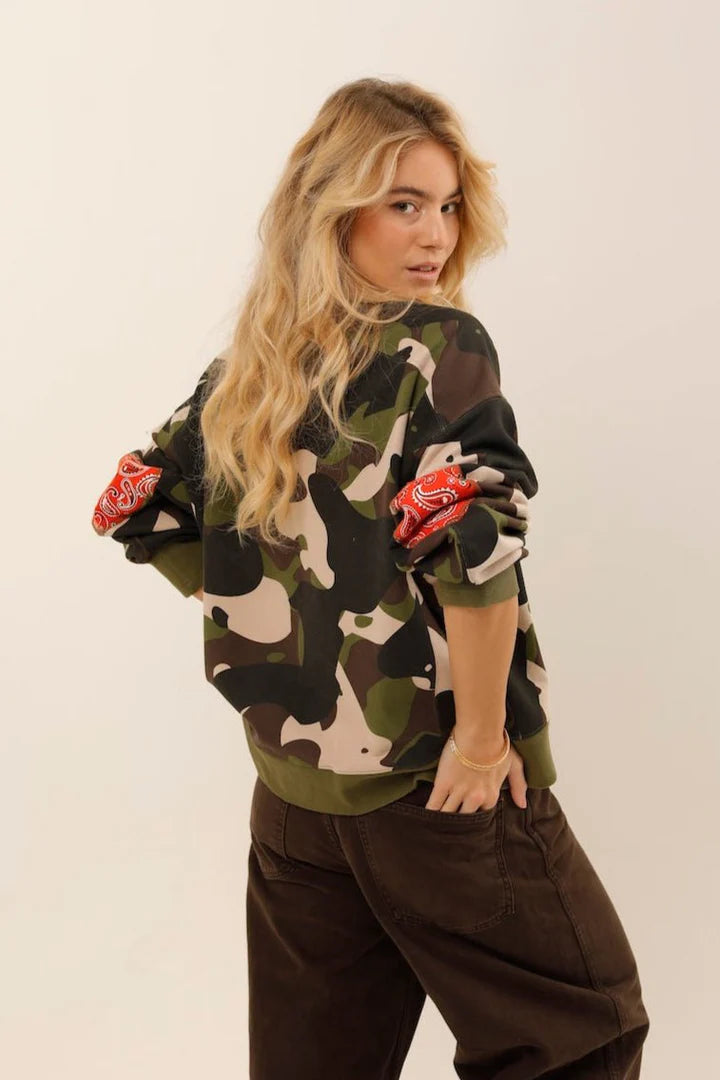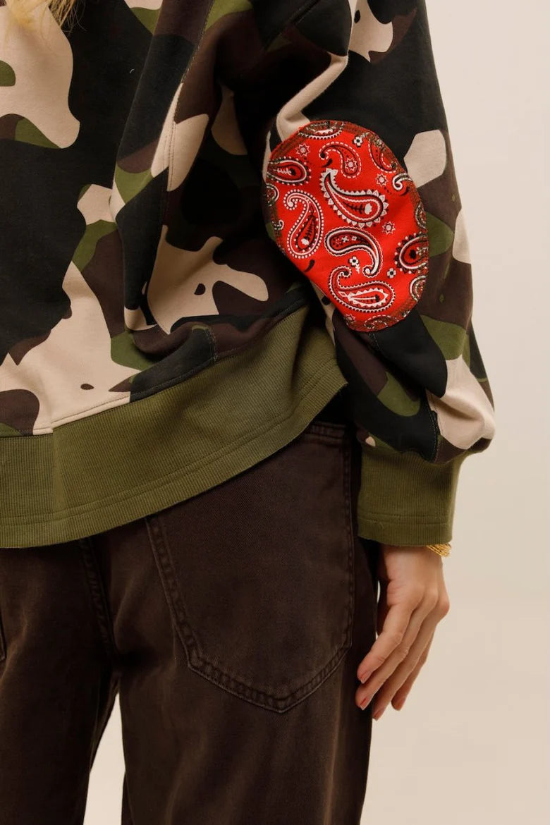 • Camouflage : molleton imprimé camouflage, coudières en bandana rouge brodé, bords-côtes kaki